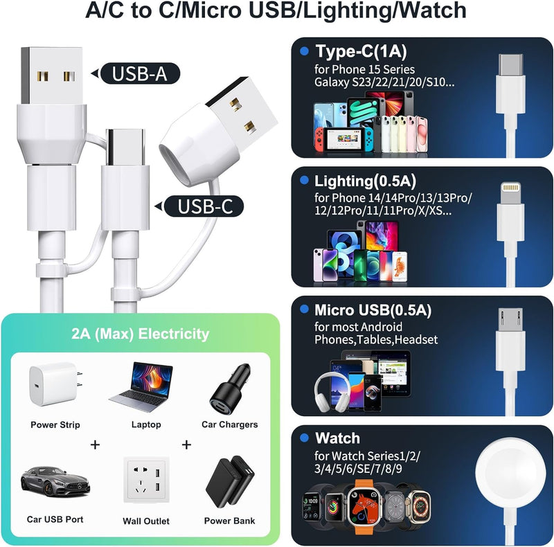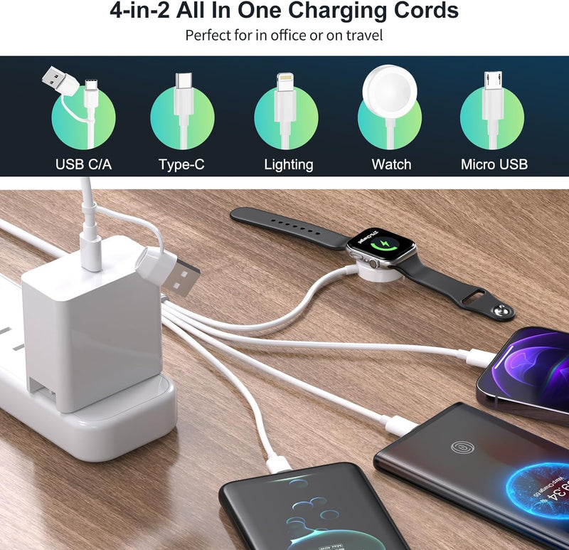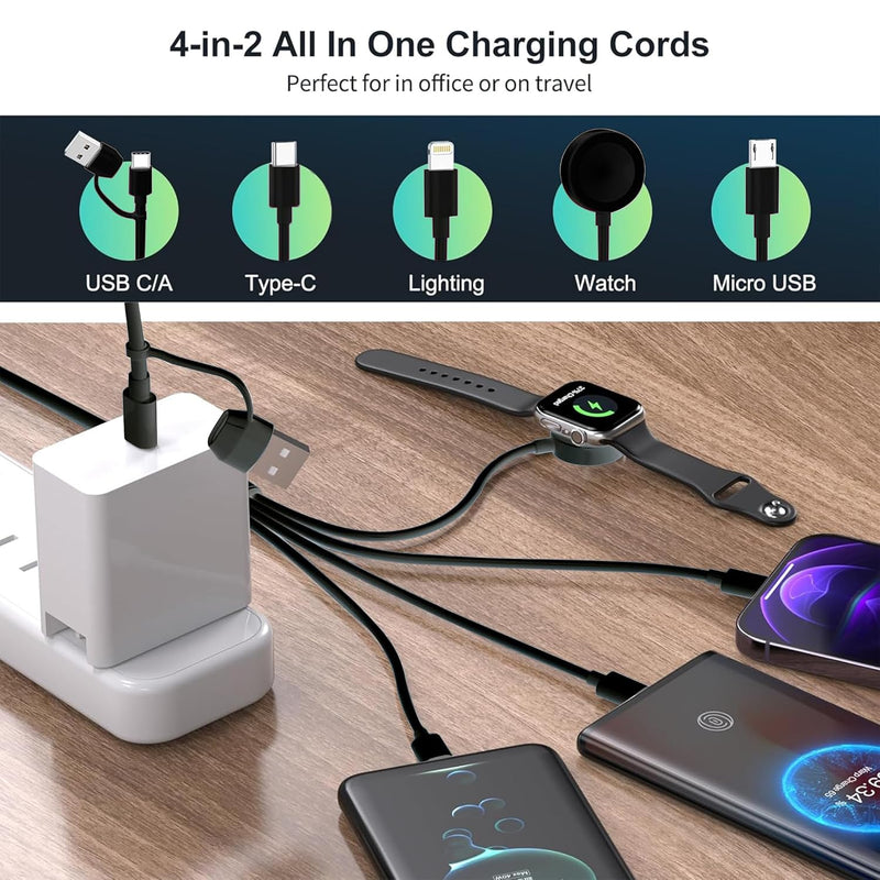 Charge all your essentials with the Gaya 4-in-2 Multi Charging Cable, the ultimate travel companion that combines Lightning, Type-C, Micro USB, and a magnetic Apple Watch charger into one sleek cable. Whether you're powering up an iPhone, Android, AirPods, or iWatch, this all-in-one cable offers unmatched convenience with USB-A and USB-C input support.