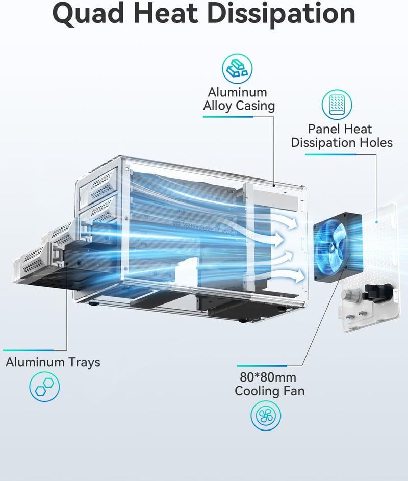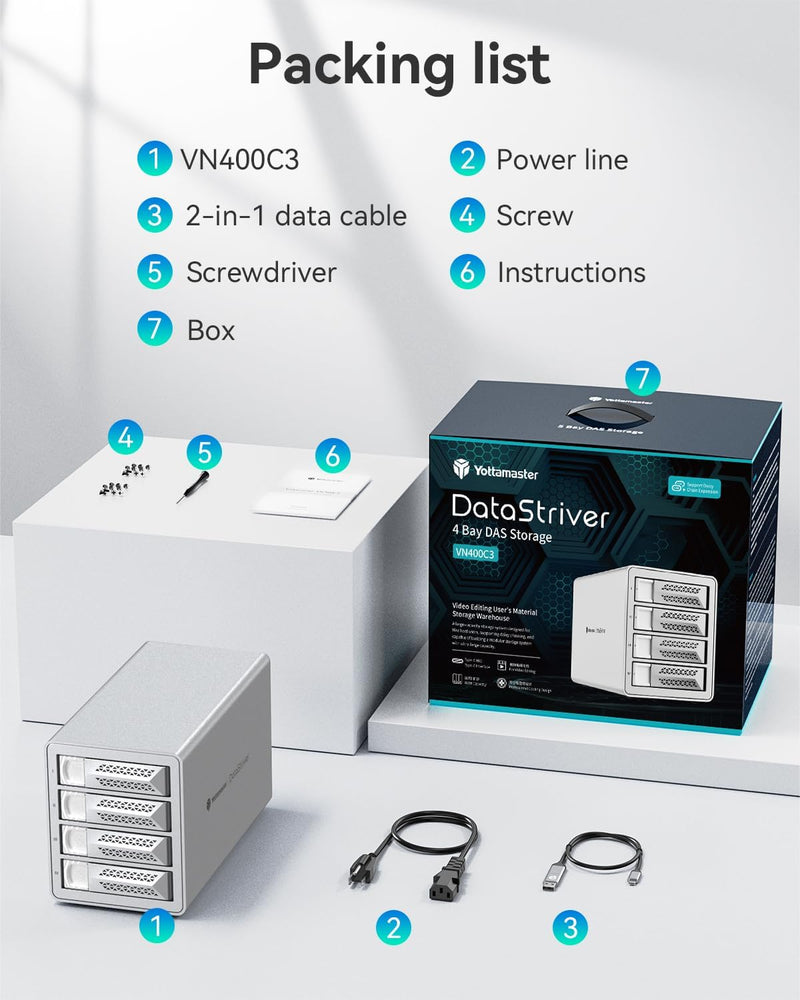 The Yottamaster VN400C3 is a high-performance 4-bay USB-C DAS enclosure delivering up to 10 Gbps SuperSpeed+ transfers for professional workflows. Designed in robust aluminum with active cooling, it supports both 2.5″ and 3.5″ SATA HDDs/SSDs, holding up to 88 TB of storage (4× 22 TB) and expanding to 264 TB via daisy-chain.